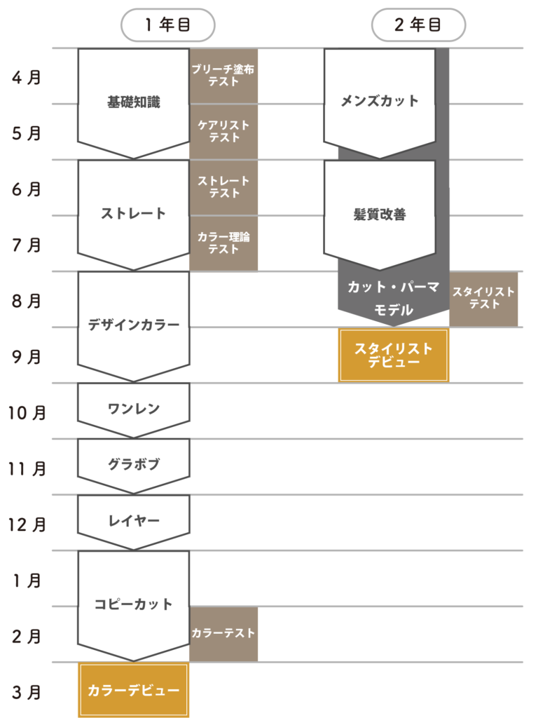 さらに4ヶ月後にはケアリスト、1年後にはカラーデビューができます。